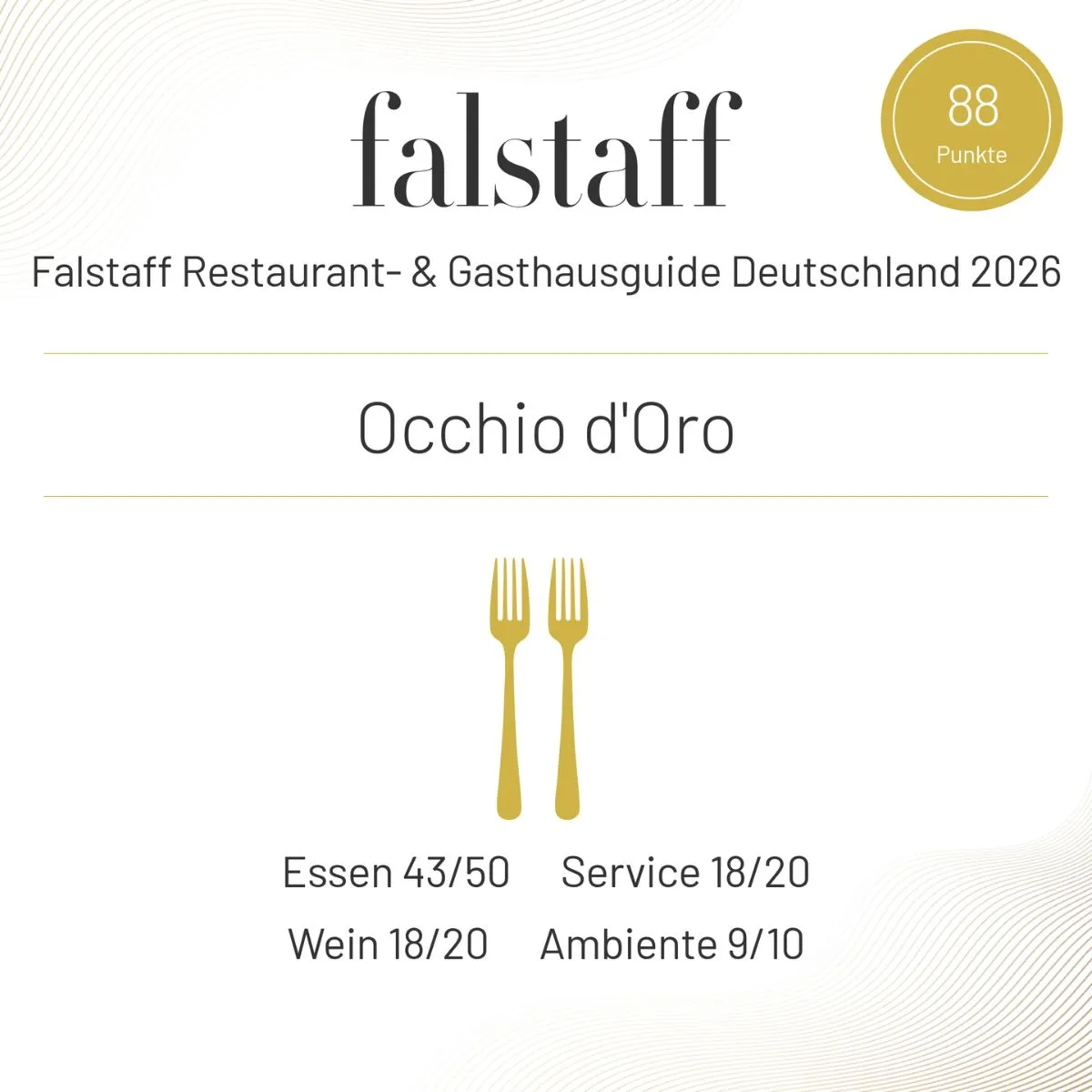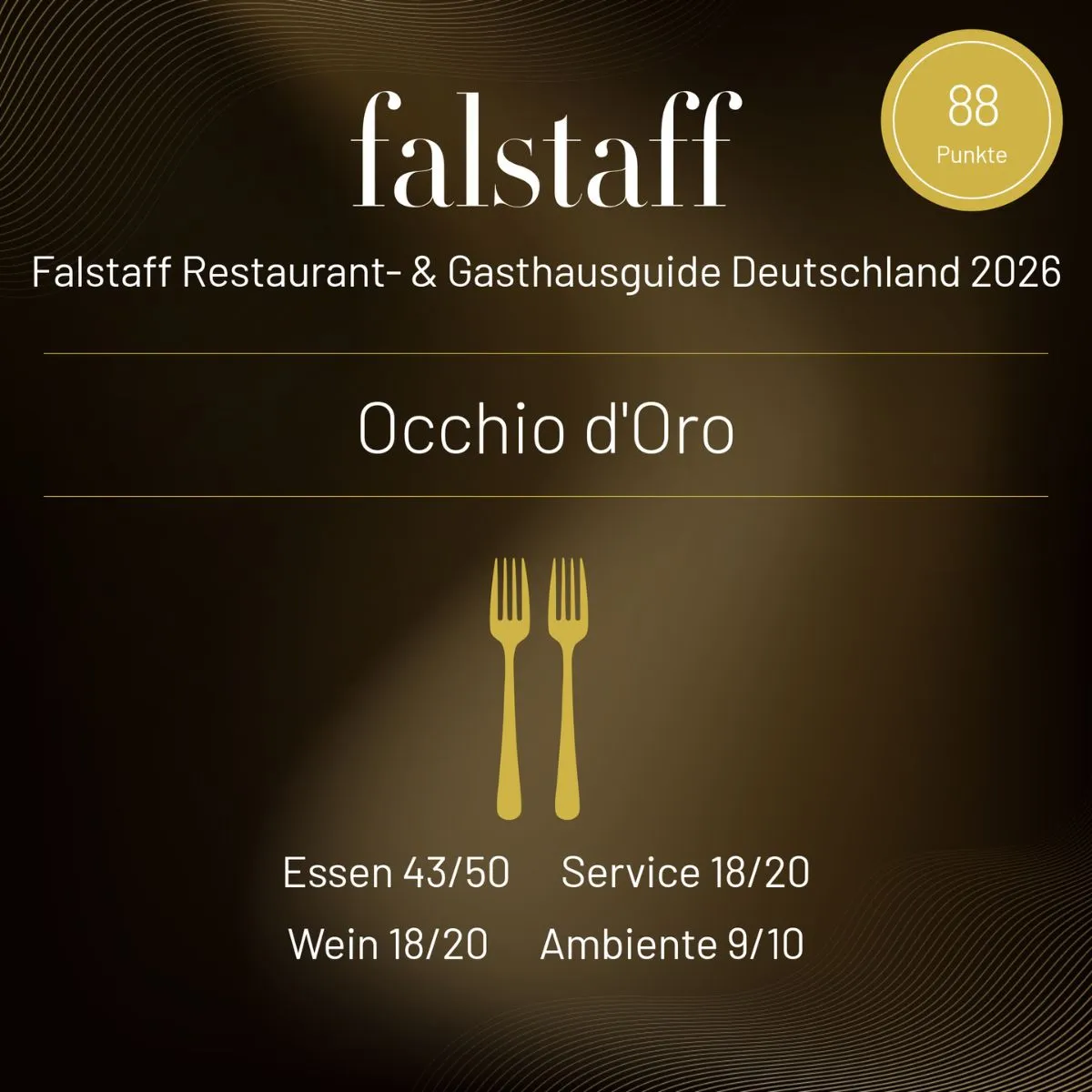 Falstaff bestätigt die Qualität unseres Service, Gerichte, Wein und Ambientes: TOP 10 der italienischen Restaurants in Deutschlands, bewertet mit 88 Punkten im Restaurant- & Gasthausguide 2026. Ein großes DANKE vom Team Occhio d'Oro.