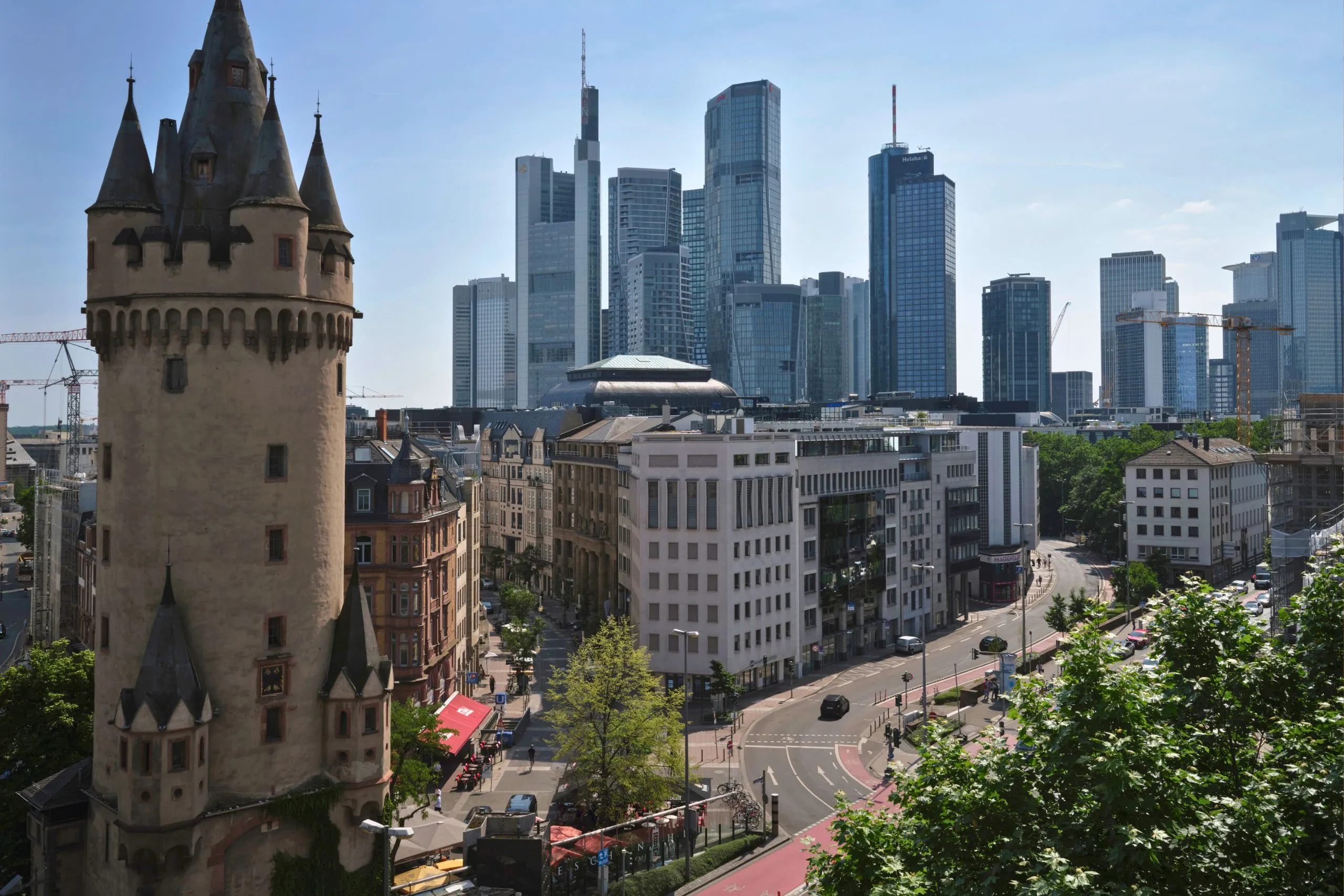 Wer im Rooftop Restaurant Occhio d’Oro die Skyline von Frankfurt betrachtet, kann ihn kaum übersehen: den Eschenheimer Turm. Zwischen glänzenden Glasfassaden und stählernen Riesen wirkt er wie ein Zeitreisender, der sich weigert, den Lauf der Jahrhunderte zu vergessen.